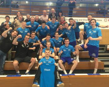 Kapitän Steve Baumgärtel nimmt in der Brüderhalle die Meisterschale in empfang. Die Handballer der …